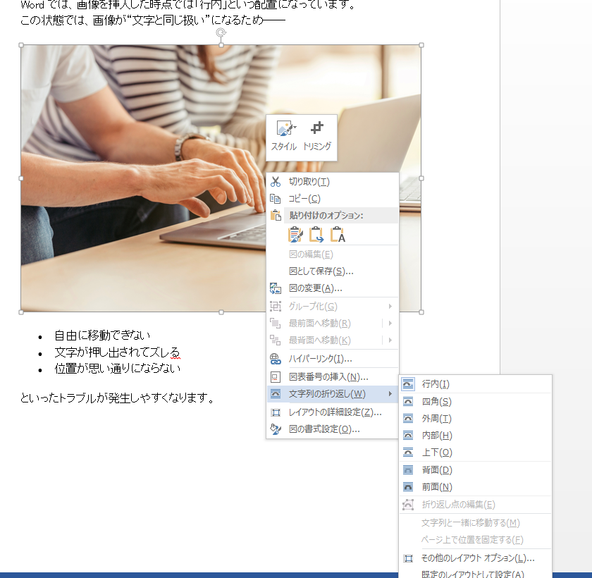 - Wordの画像は「行内配置」だと自由に動かせない