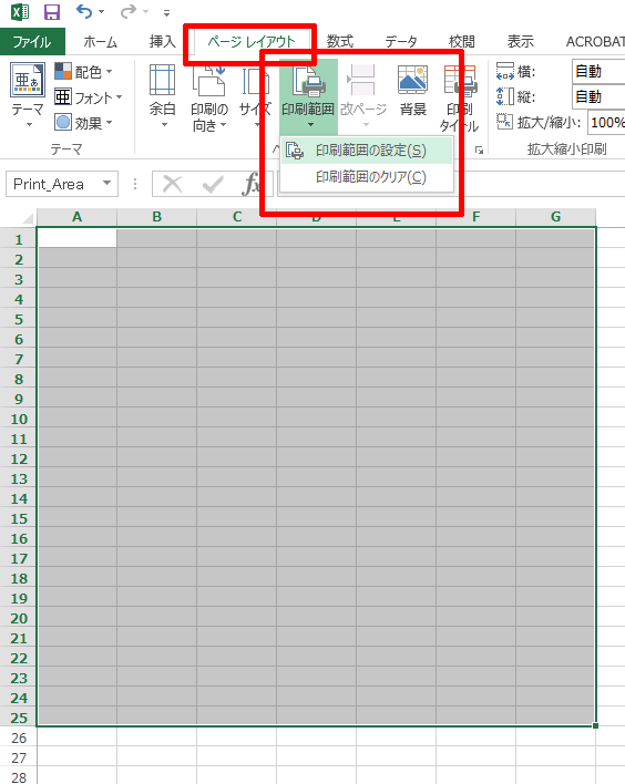 2. 「ページレイアウト」→「印刷範囲の設定」をクリック