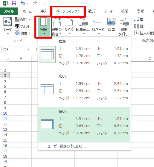 1. 「ページレイアウト」→「余白」から「狭い」を選択