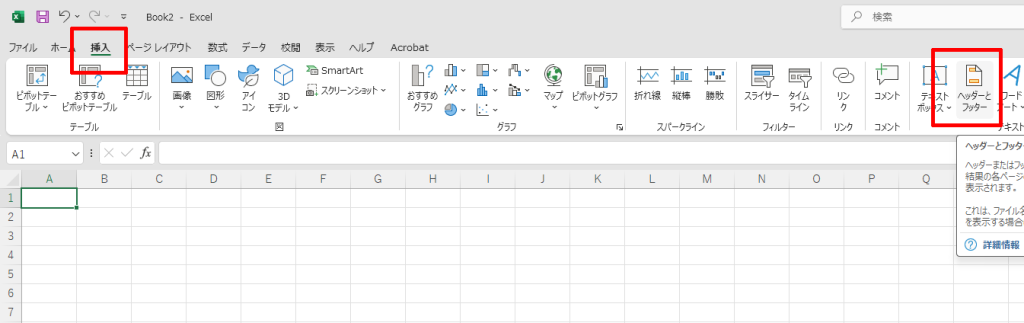 ヘッダー(上部)またはフッター(下部)の「左・中央・右」のいずれかの枠をクリックします。